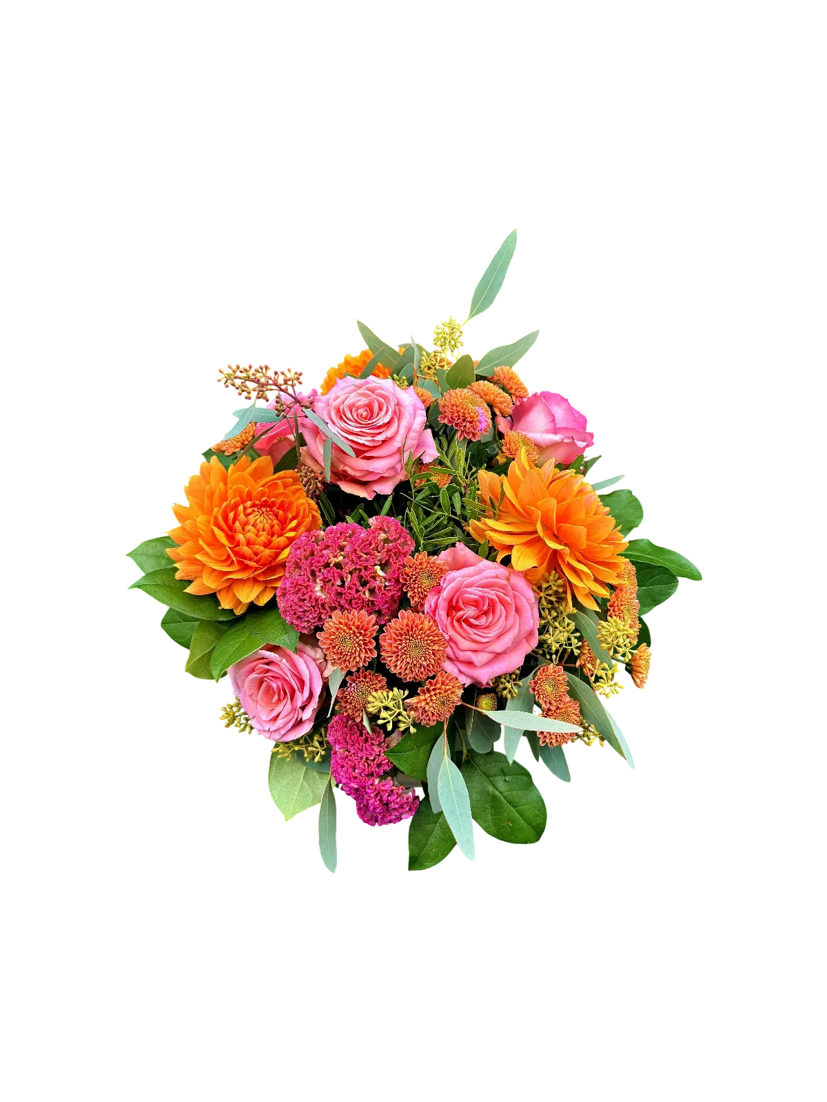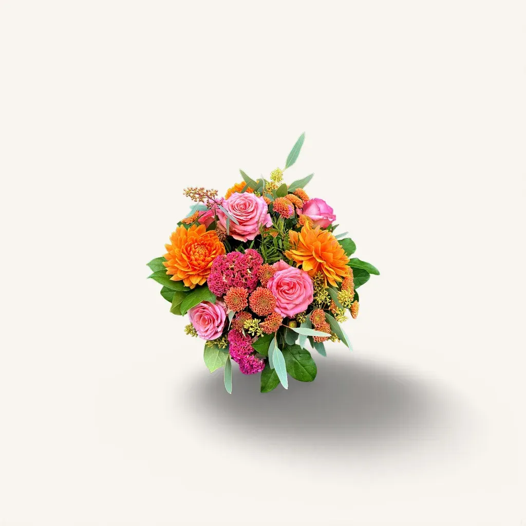 Bouquet du mois d’octobre aux tons chauds, pensé pour célébrer les dahlias du pays : un accord automnal où denses dahlia orange embrassent de délicates roses roses, petits chrysanthèmes corail et célosies veloutées. Le tout relancé par des touches d’eucalyptus argenté et un feuillage profond, pour une composition ronde, couture et chaleureuse, parfaite pour un intérieur genevois qui célèbre l’automne.