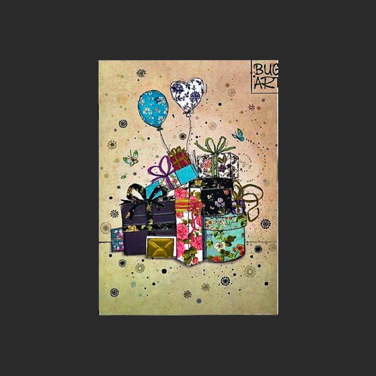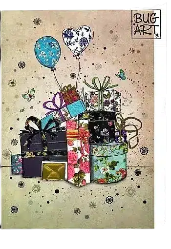 Carte de vœux illustrée, conçue pour glisser dans un bouquet et sceller un geste — une composition graphique de boîtes-cadeaux ornées de motifs floraux, de ballons légers et de petits papillons. Cette pièce d’atelier, au grain de papier légèrement ivoire, accompagne les bouquets en apportant une note festive, délicate et résolument artisanale au présent.