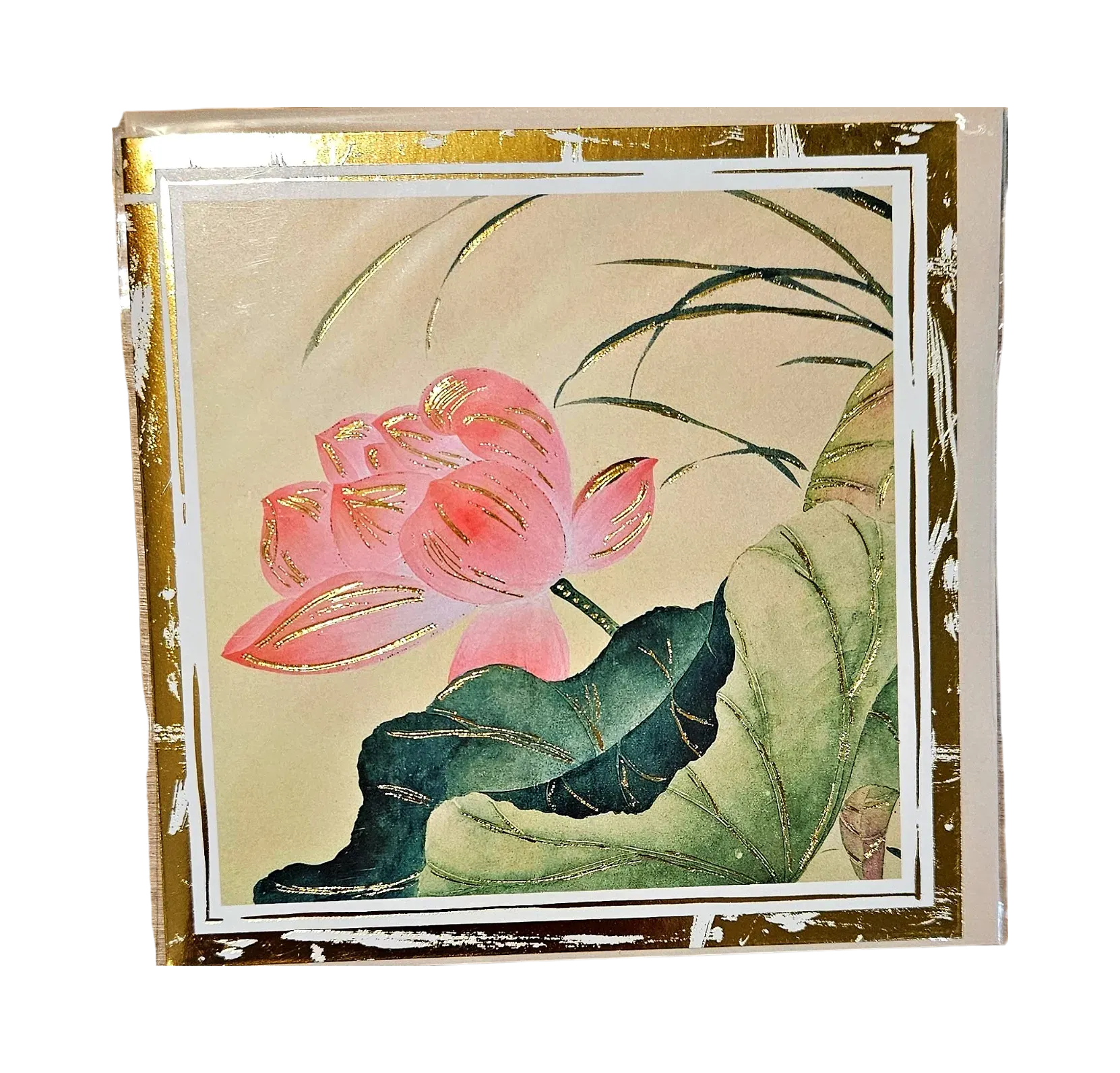 Carte de vœux raffinée, conçue pour s’insser avec un bouquet ou une composition : une fleur de lotus rose délicate se déploie sur un fond crème, ses pétales ponctués de filets dorés qui captent la lumière comme un souffle. Papier épais à grain, tranche dorée et finition subtilement satinée — un accompagnement élégant qui prolonge le geste floral d’une note printanière et aquatique.