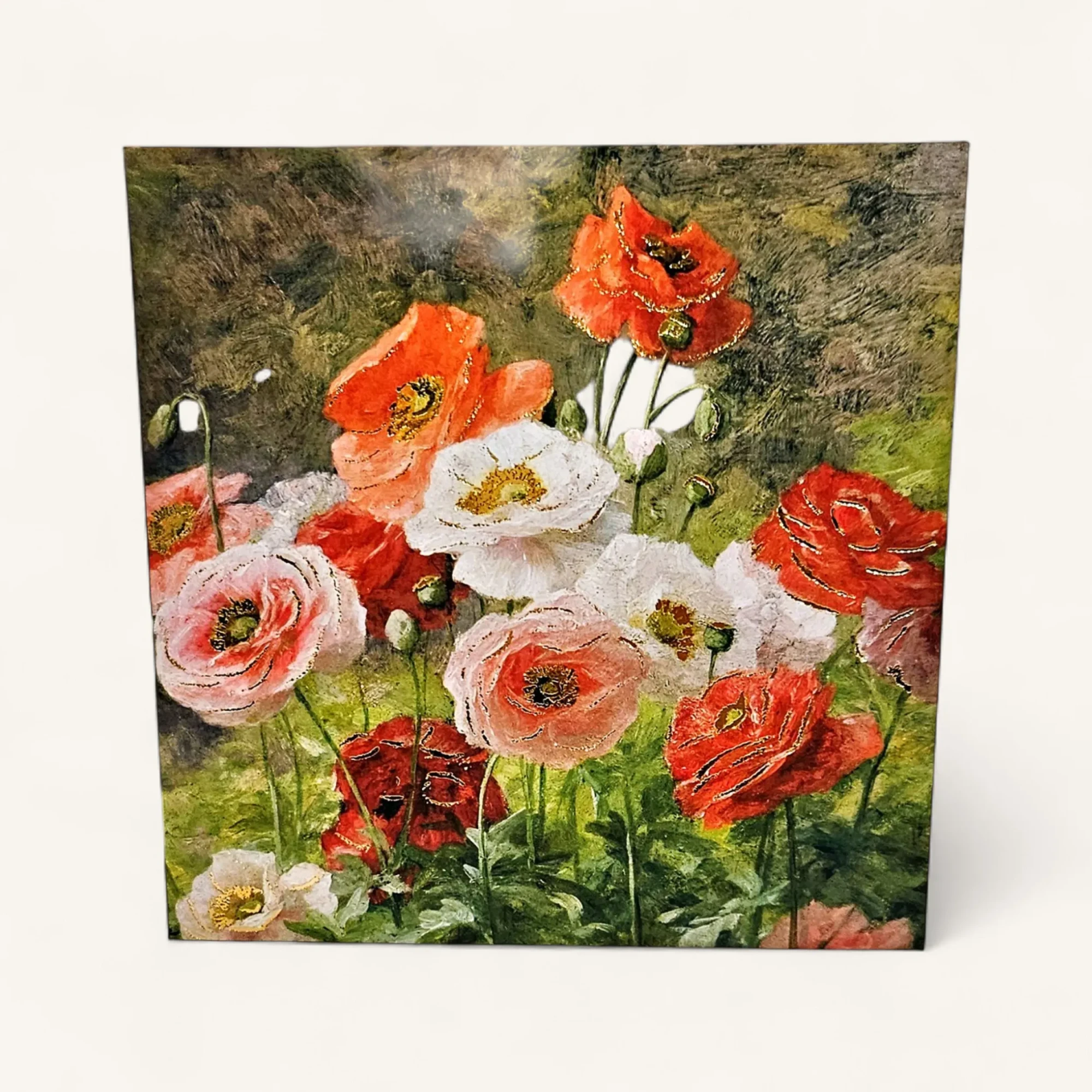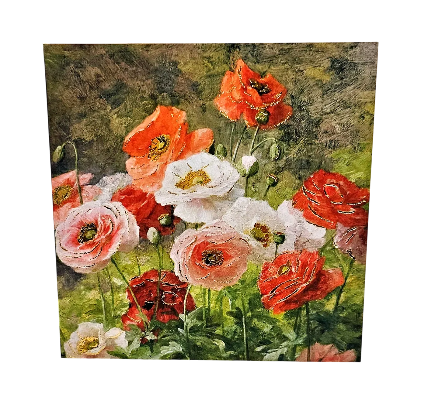 Carte de vœux illustrée haute qualité, pensée pour accompagner un bouquet : une peinture texturée de pavots et de renoncules aux tons rouge, rose et ivoire, rehaussée de touches dorées qui captent la lumière. Papier épais à grain artisanal, tranche douce et format idéal pour glisser entre les tiges — une présence raffinée qui prolonge la composition florale et le geste d’offrir.