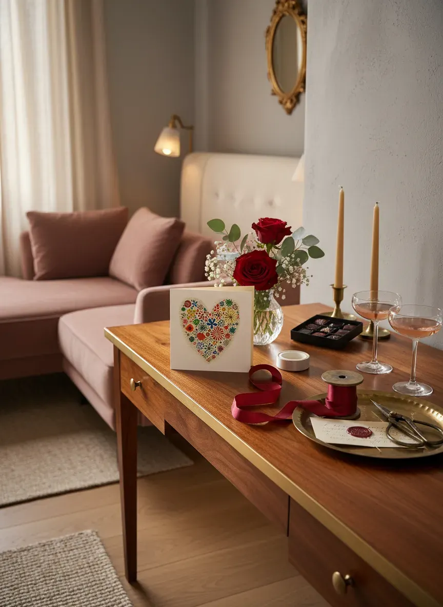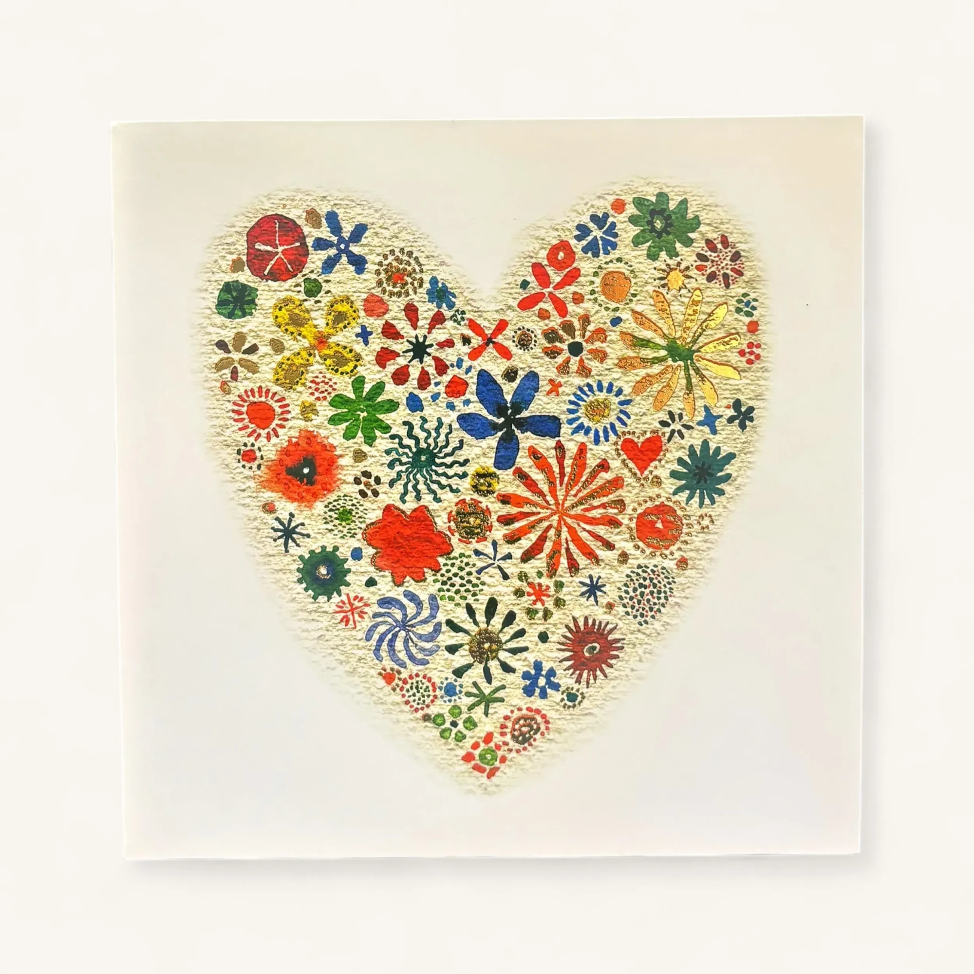 Carte artisanale de Saint‑Valentin, présentée comme un petit écrin d’atelier : au centre, un grand cœur tissé de centaines de motifs floraux miniatures — volutes, rosaces et petites fleurs peintes — aux rouges, roses, bleus et verts vifs, appliqués en léger relief sur un cartonnage ivoire à grain fin. Objet tactile et graphique, elle se lit au toucher autant qu’à la vue ; pensée pour accompagner un bouquet ou devenir un souvenir, elle apporte une note délicate et sophistiquée au geste amoureux (contexte : «Carte de voeux pour la Saint‑Valentin»).