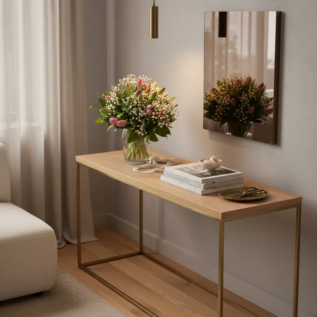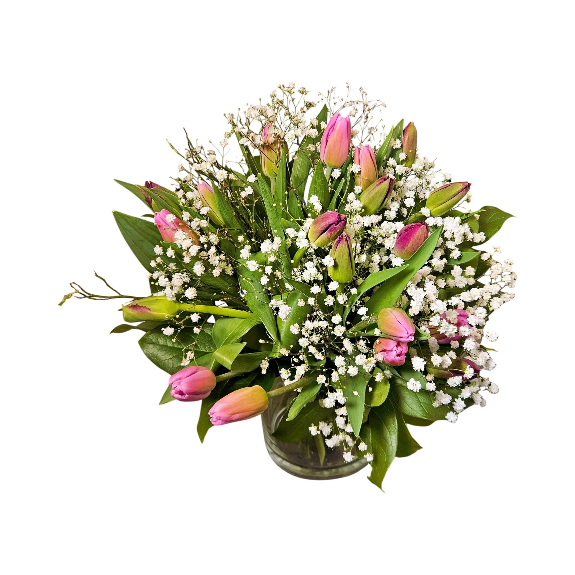 Un bouquet dʼatelier où la pudeur du printemps se fait visible : boutons de tulipes du pays roses, serrés comme des promesses, baignés dʼun nuage de gypsophile et soutenus par un feuillage vert brillant. Présenté dans un vase en verre facetté, il offre une silhouette légère et contemporaine, parfaite pour une délicate attention ou une mise en scène raffinée dans un intérieur genevois.