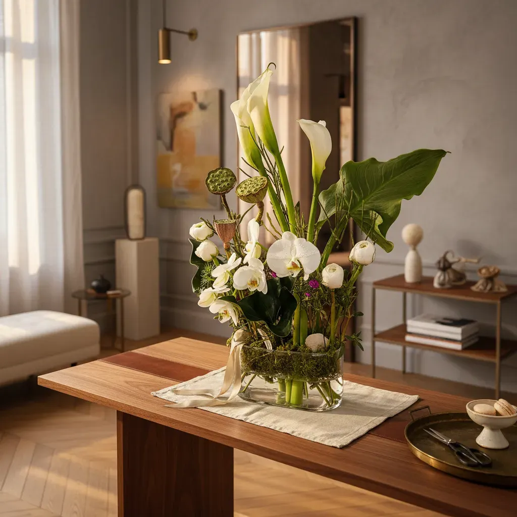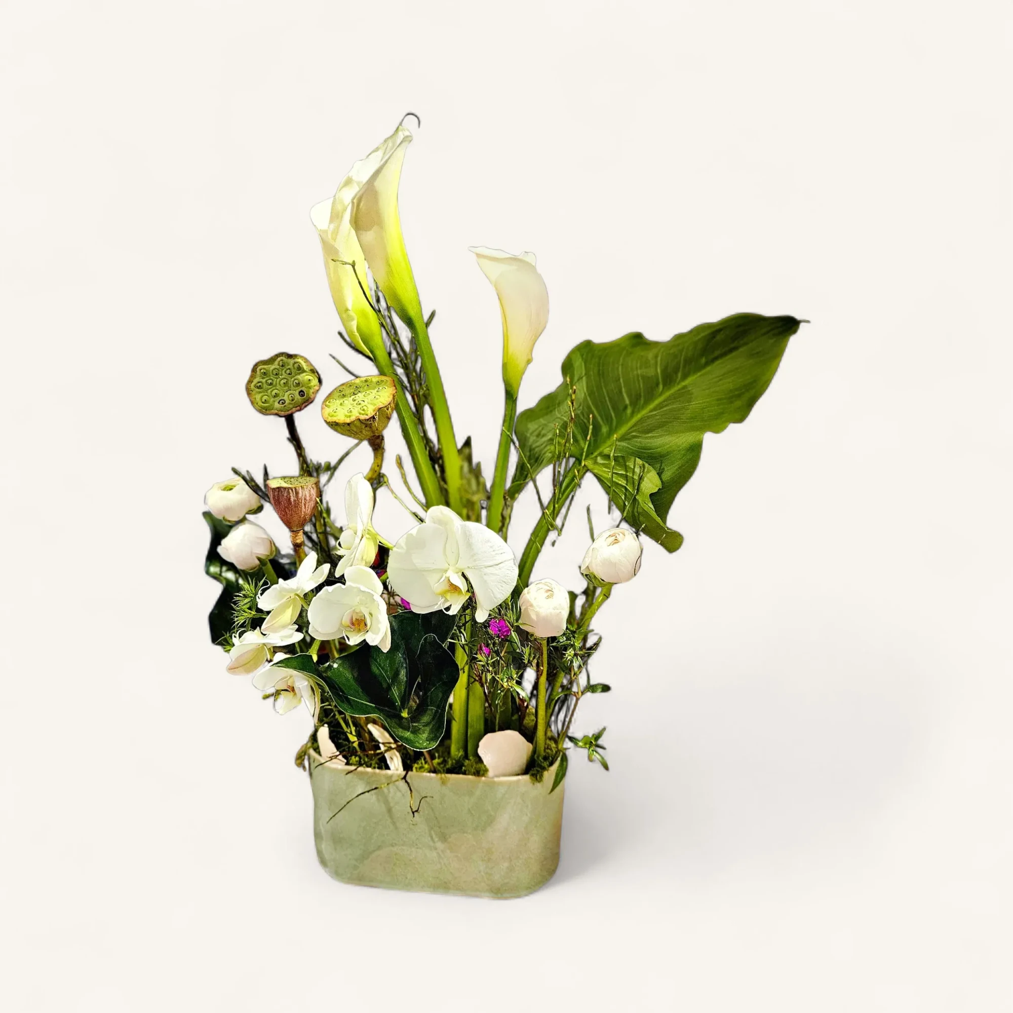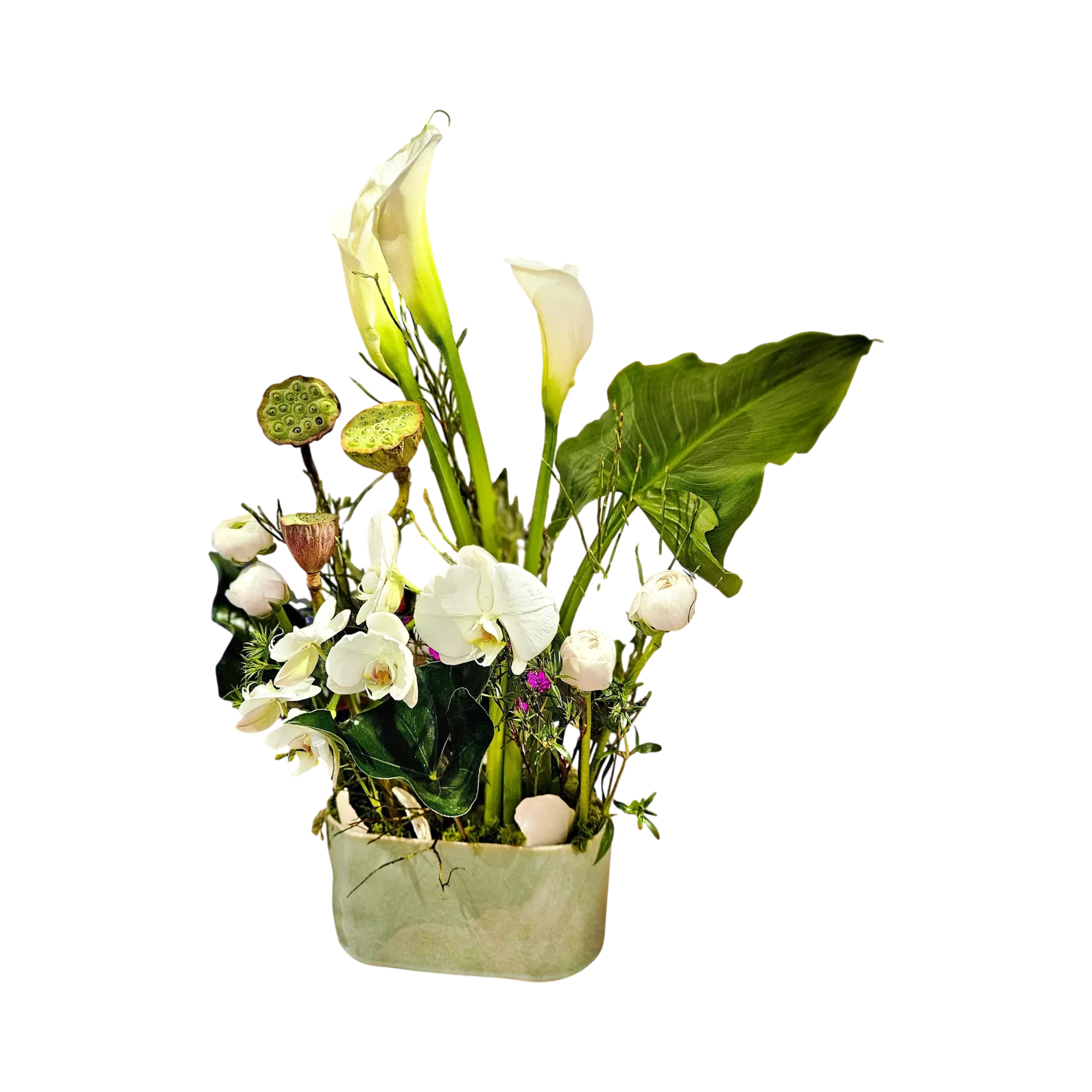 Une composition sculpturale et lumineuse, pensée comme un écrin de calme pour un intérieur genevois : arums blancs élancés dessinent l’axe, phalaenopsis nacrées apportent la soie, tandis que renoncules en bouton ourlent la base. Pods de lotus et capsules séchées ponctuent la silhouette d’un geste graphique, la mousse dissimule la mécanique et l’ensemble respire la pureté retenue — une pièce idéale pour une réception, un comptoir ou une table d’accueil.