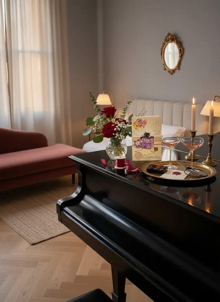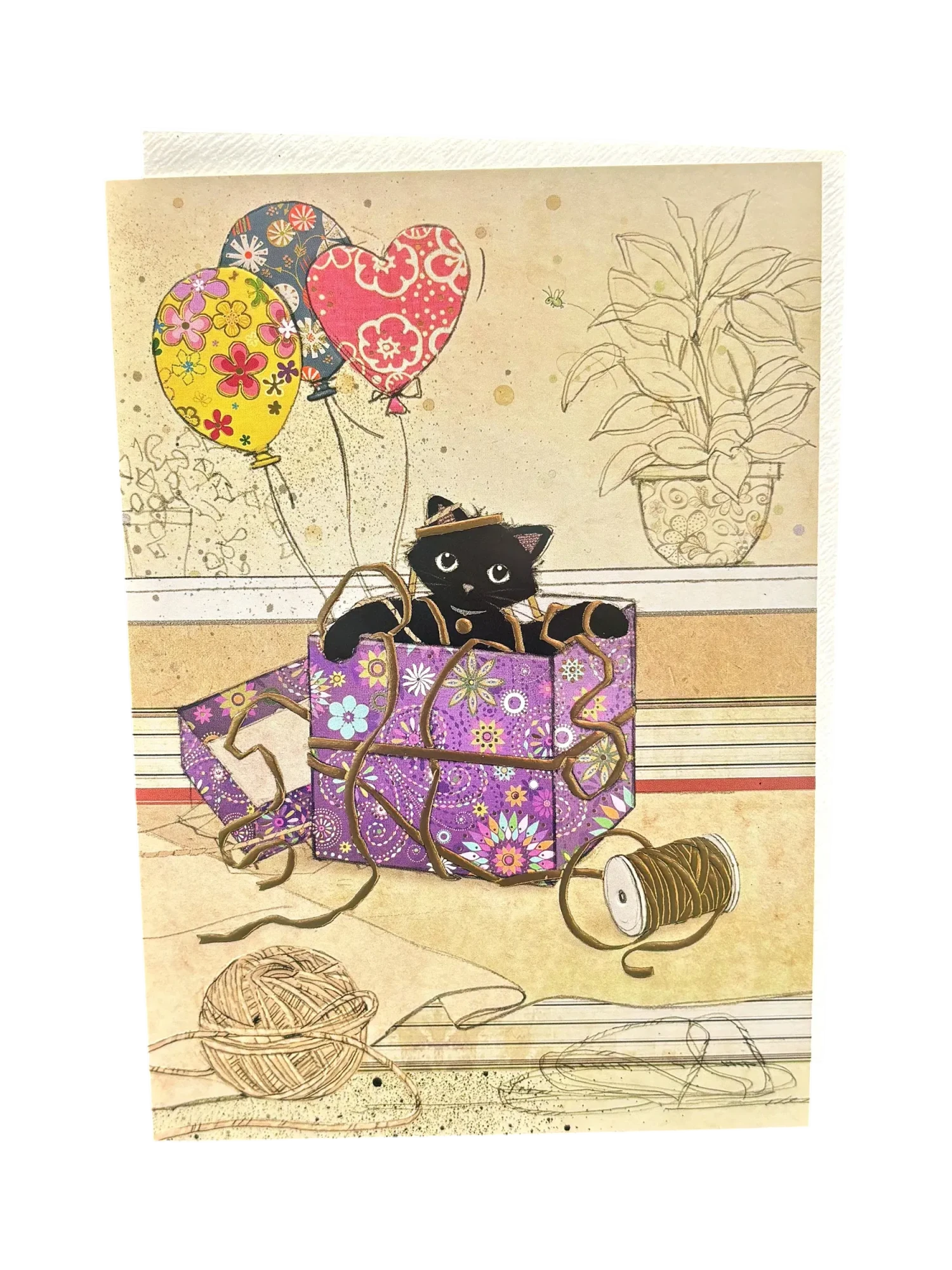 Carte de vœux pour la Saint‑Valentin au ton espiègle et précieux : un recto illustré où un petit chat noir joue à se cacher dans un cadeau violet orné de motifs floraux, entouré de ballons en forme de cœur et d’un dessin de plante en arrière‑plan. Imprimée sur un cartonnage ivoire texturé à grain fin, la pièce conjugue humour et élégance — un accompagnement délicat pour un bouquet offert à l’amour, signalé par l’auteur de la photo comme «Carte de voeux pour la Saint‑Valentin».