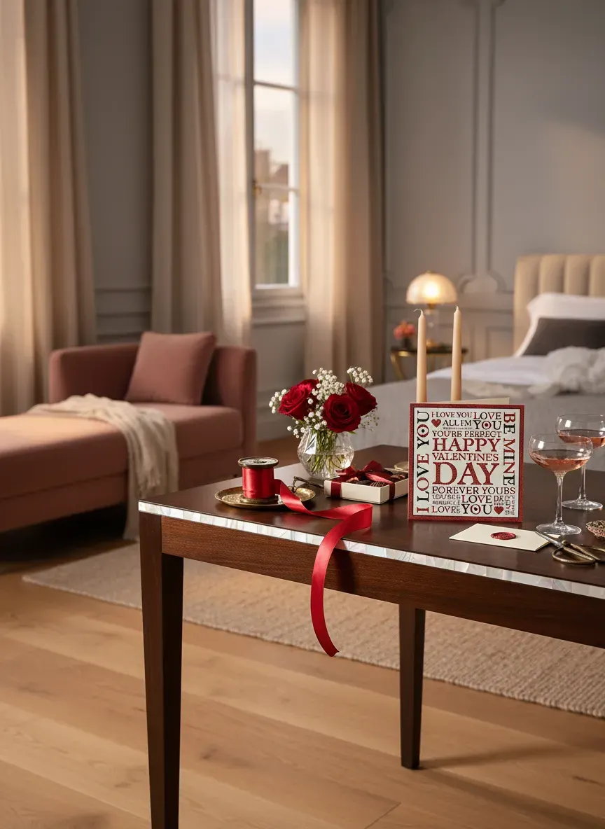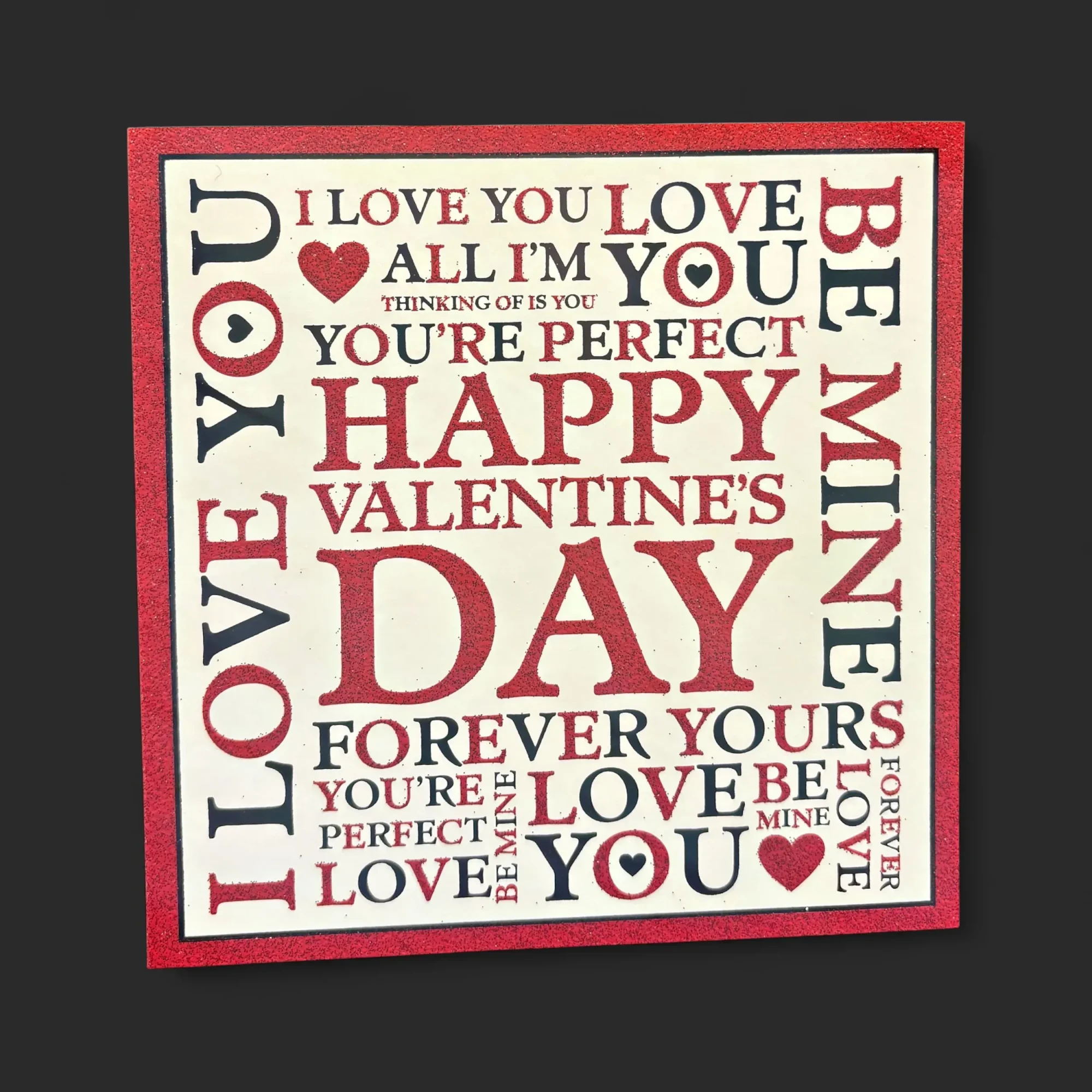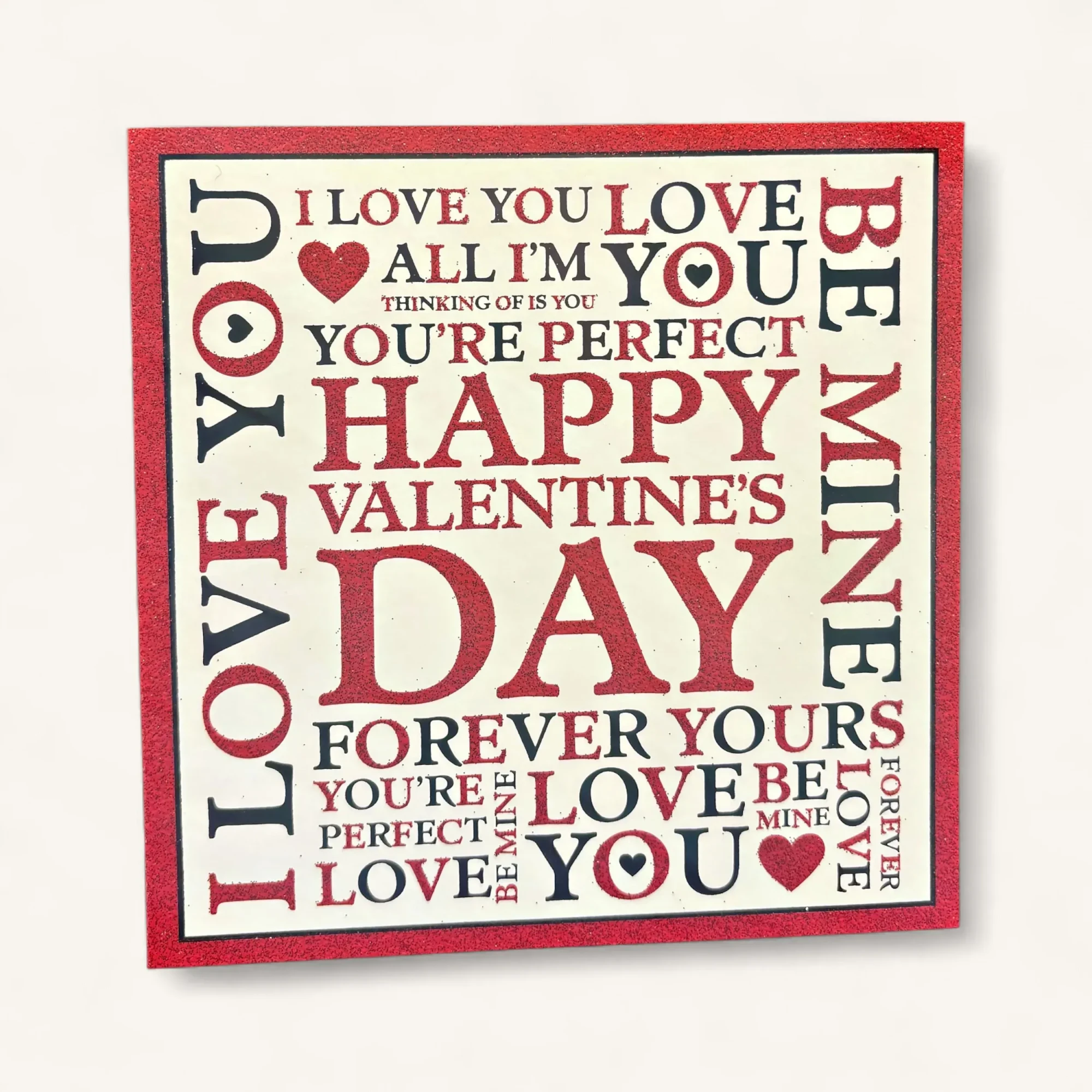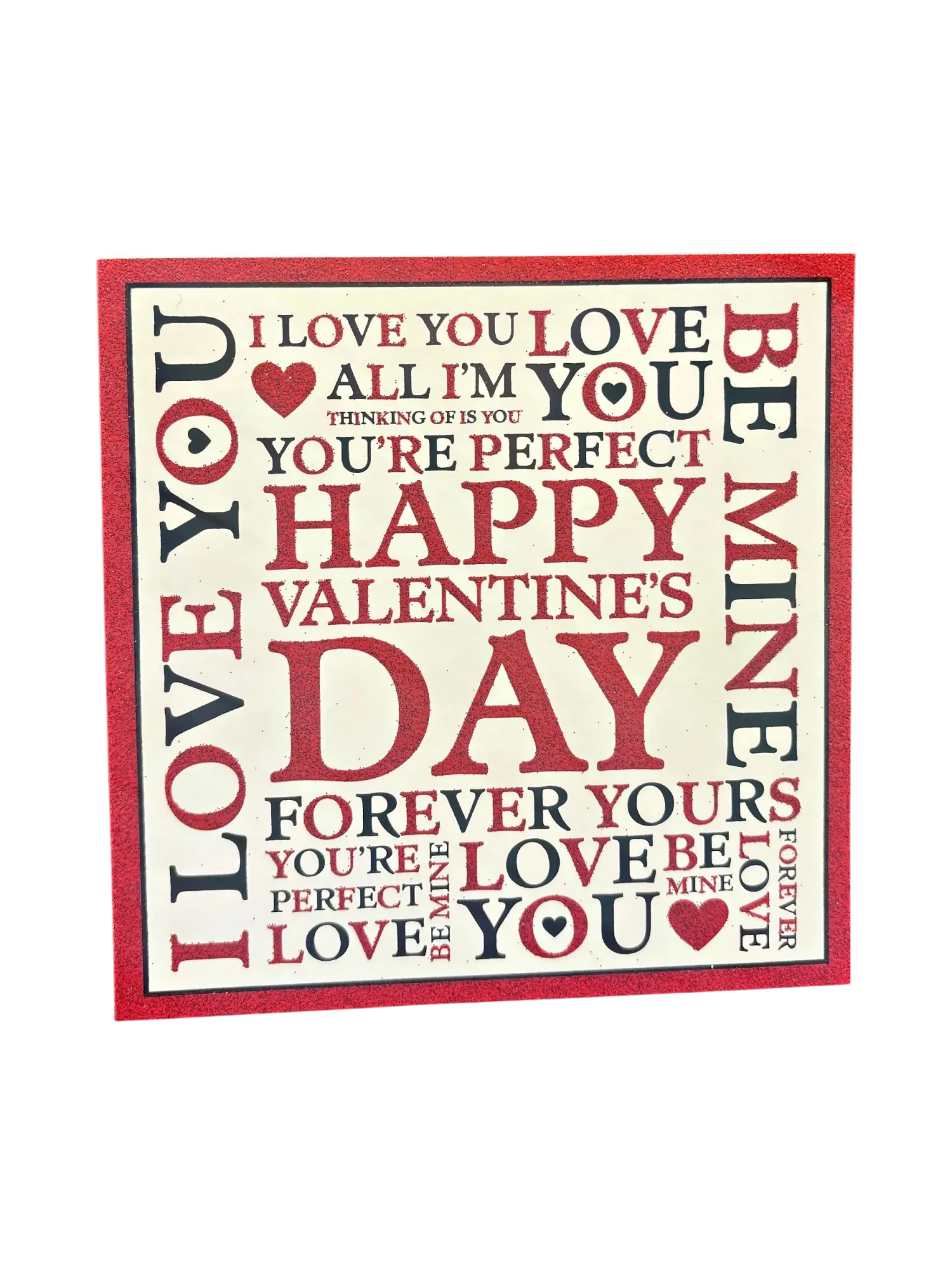 Carte de vœux artisanale pour la Saint‑Valentin, imprimée sur un cartonnage ivoire rehaussé d’un pourtour rouge pailleté et d’un camaïeu typographique où le mot « DAY » s’élève en lettre capitale. Le recto joue de contrastes — lettres rouges encre métallisée, cœurs graphiques et petits pictogrammes — pour offrir un objet à la fois ludique et précieusement tactile. Mentionnée par l’auteur comme «Carte de voeux pour la Saint‑Valentin», elle se glisse dans une enveloppe satinée et devient un geste élégant, à offrir seul ou en compagnie d’un bouquet.