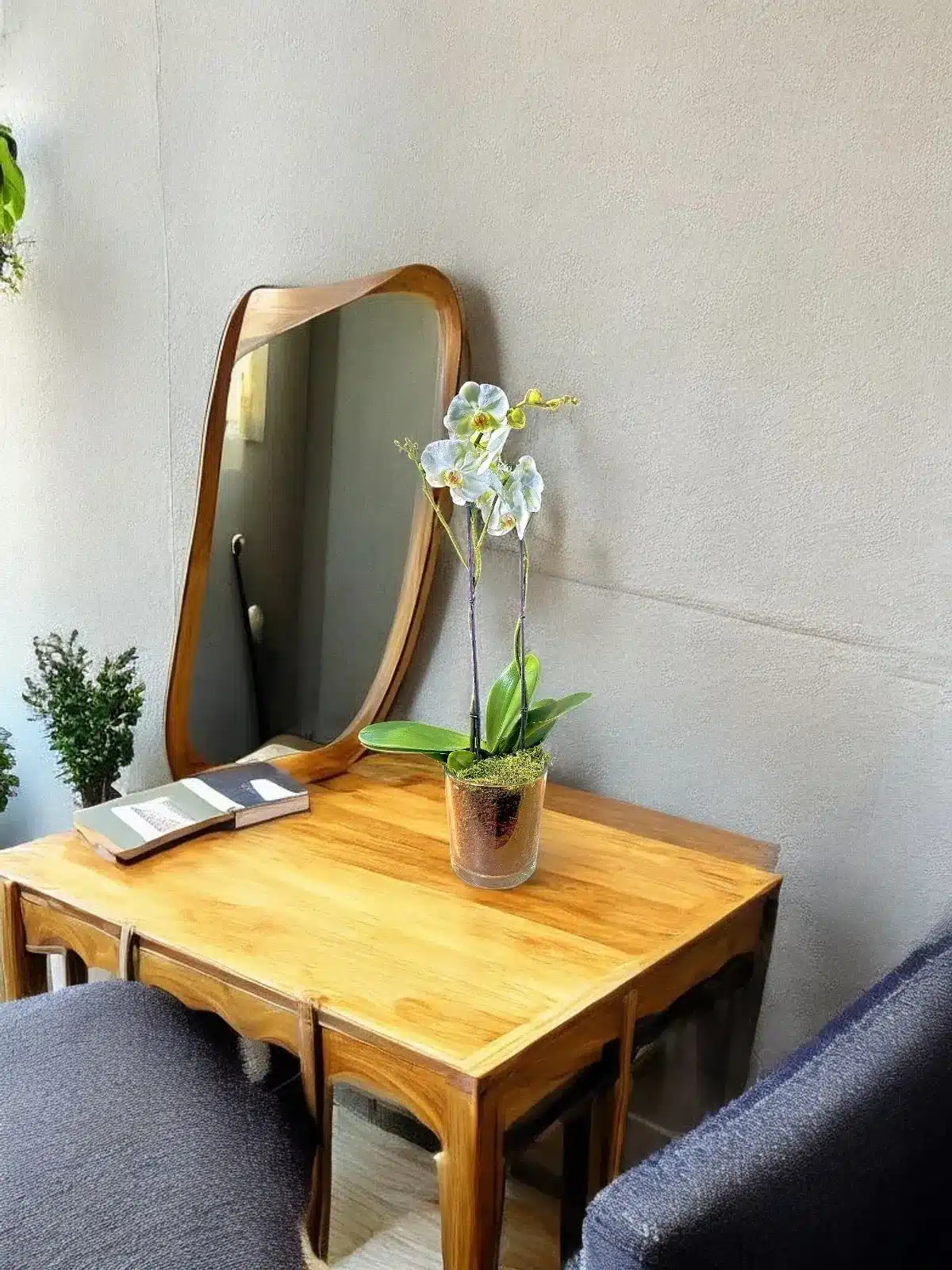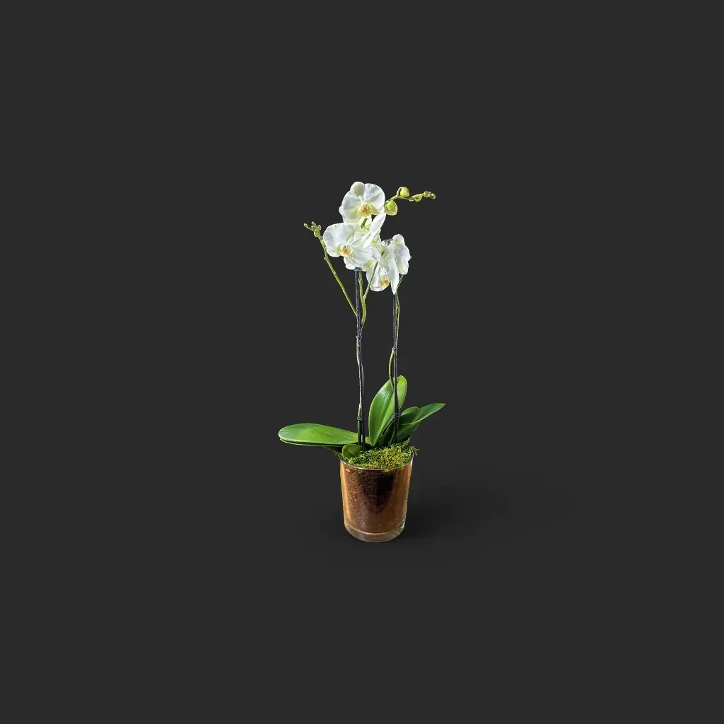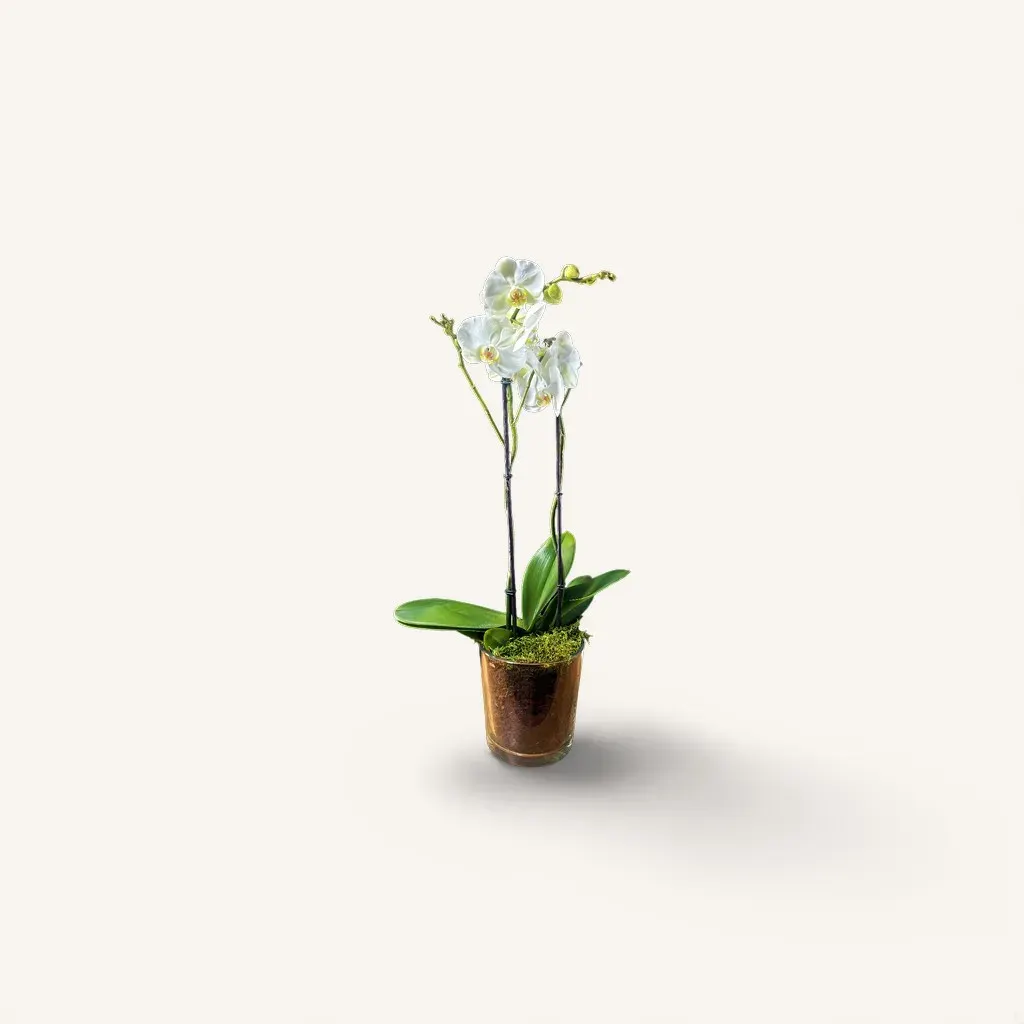 Photo fournie sans commentaire ; une phalaenopsis blanche présentée en pot verre émerveille par sa simplicité noble. Deux hampes florales élancées, soutenues par tuteurs discrets, portent des fleurs d’albâtre au cœur jaune-orang é qui captent la lumière comme des petites lunes — feuilles larges et vernies, substrat d’écorce visible et tapis de mousse apportent une texture naturelle et précieuse. Idéale comme cadeau durable ou comme pièce décorative raffinée pour un intérieur genevois contemporain.