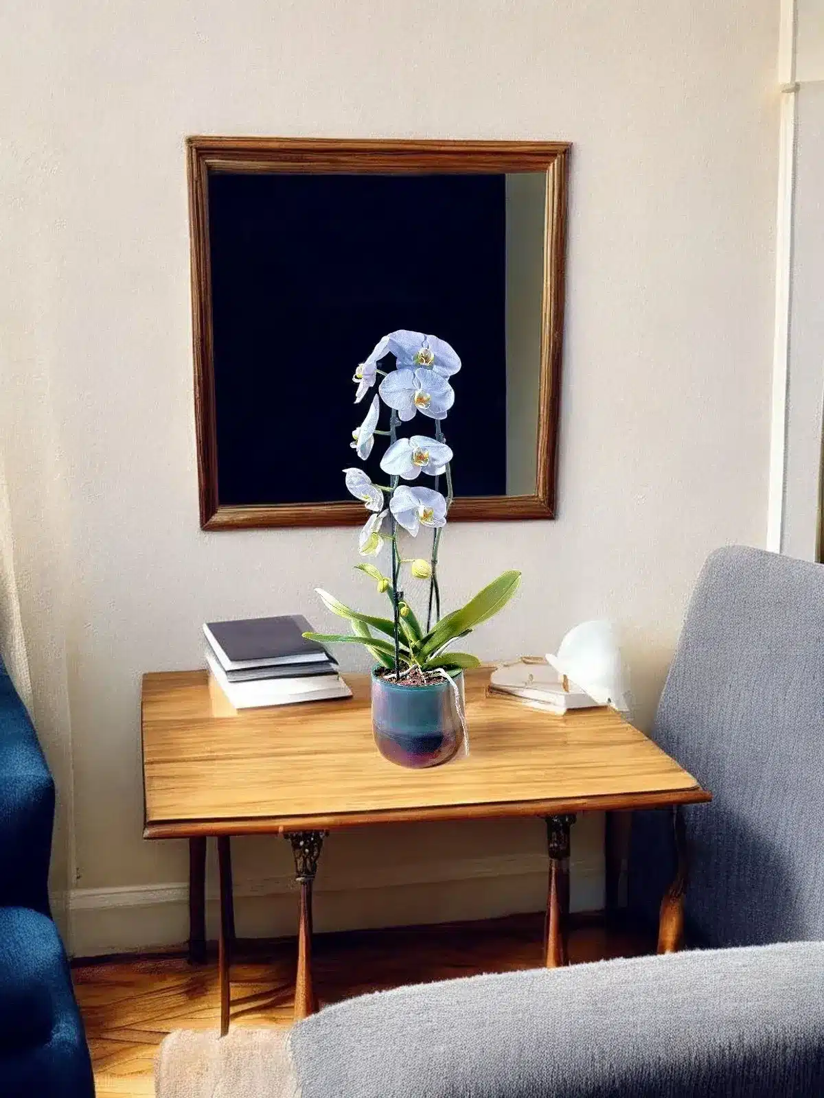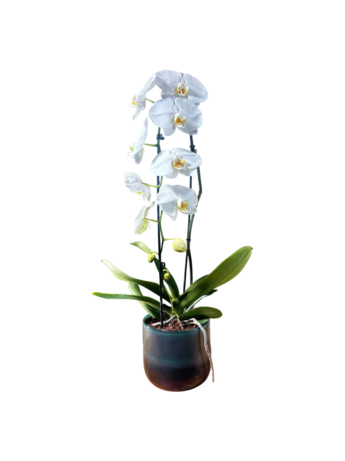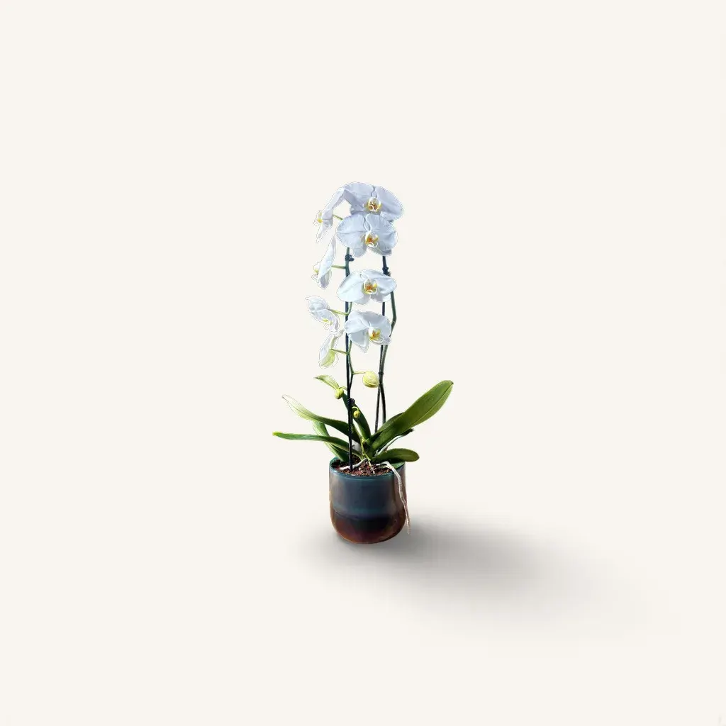 Dans un geste de pure élégance, cette orchidée phalaenopsis blanche se dresse sur deux tiges fines, parées de grandes fleurs immaculées au cœur jaune-orangé. Présentée en pot céramique profond sur un mélange d’écorce, elle associe la sobriété contemporaine à la noblesse botanique — parfait pour un intérieur genevois qui cherche une pièce végétale raffinée et pérenne. Tiges attachées à des tuteurs discrets, feuilles charnues et racines aériennes offrent un contraste texturé qui sublime la lumière naturelle.