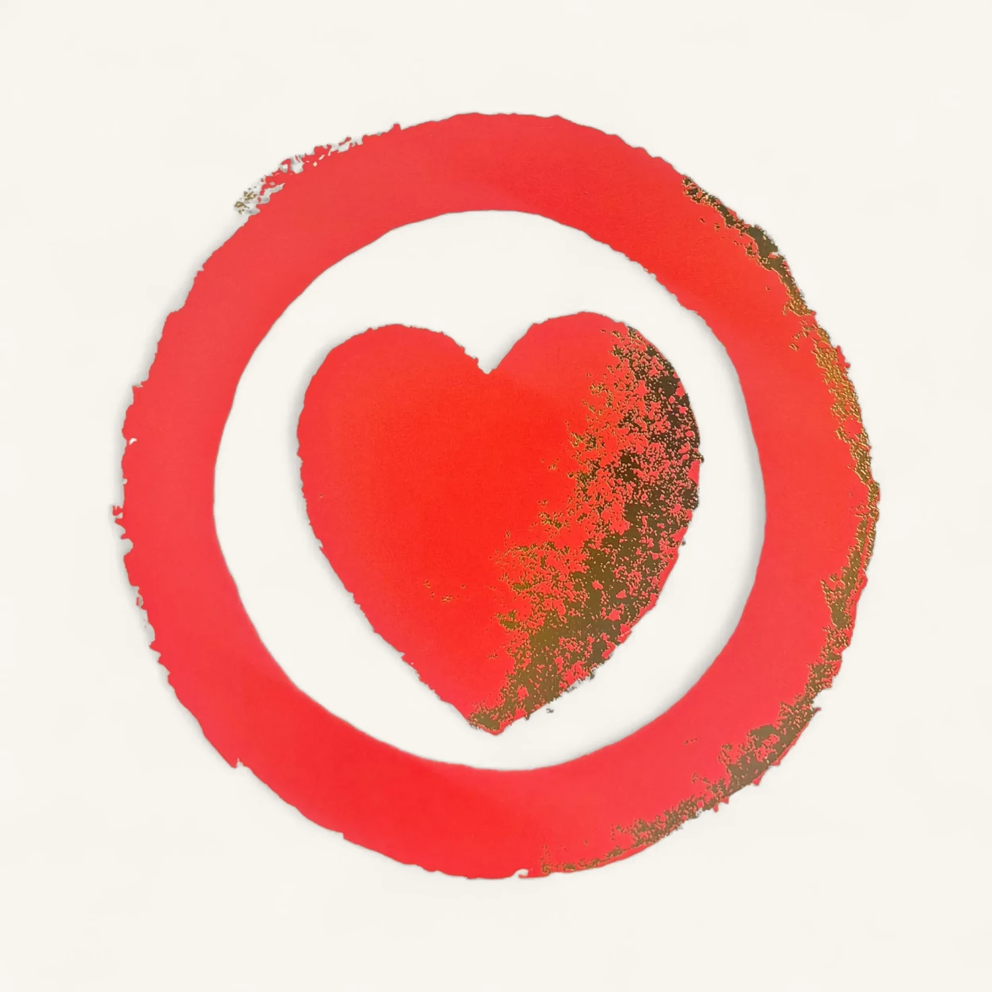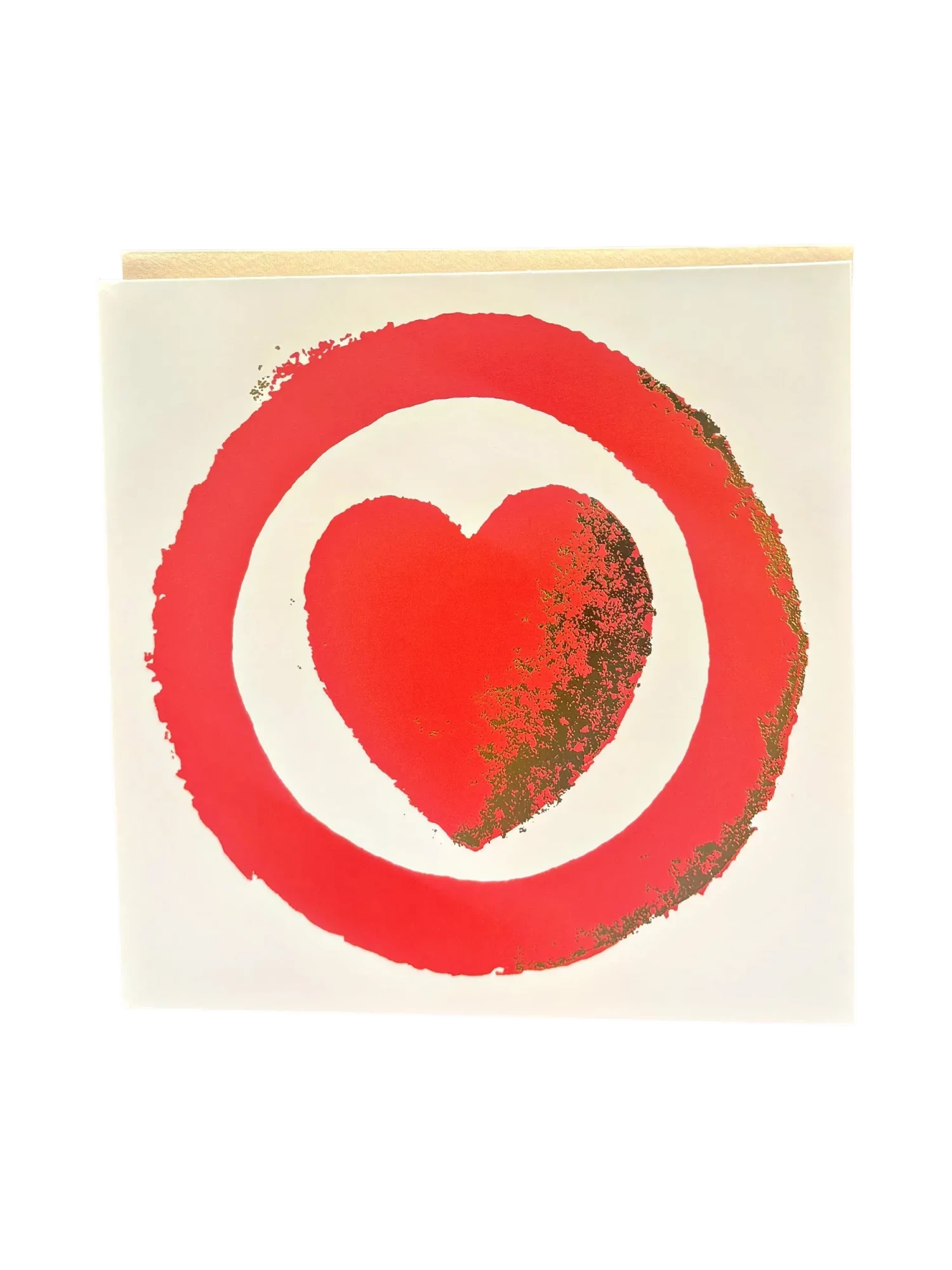 Carte de vœux raffinée pour la Saint‑Valentin, éditée comme un petit objet d’atelier : un grand cœur rouge inscrit dans un anneau rouge plus large, imprimé en aplat sur un cartonnage ivoire à fort grammage. Les bords effrités et un discret effet pailleté doré sur la tranche droite apportent une nuance artisanale et précieuse ; posée debout sur une table sombre, elle affirme une présence graphique et intime, parfaite pour accompagner un bouquet ou se glisser dans une enveloppe précieuse.