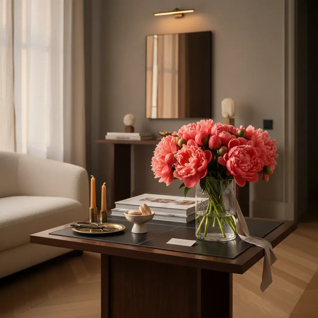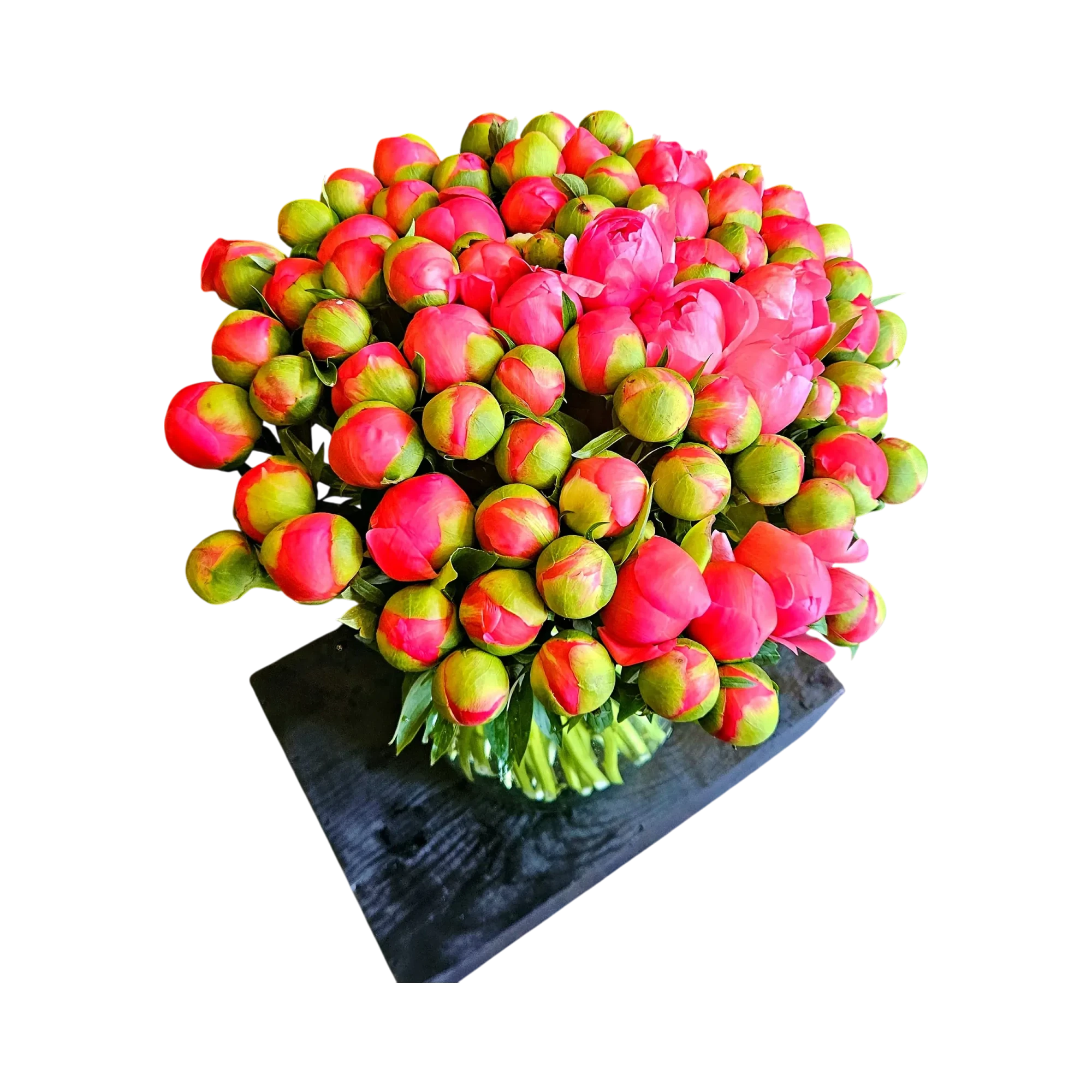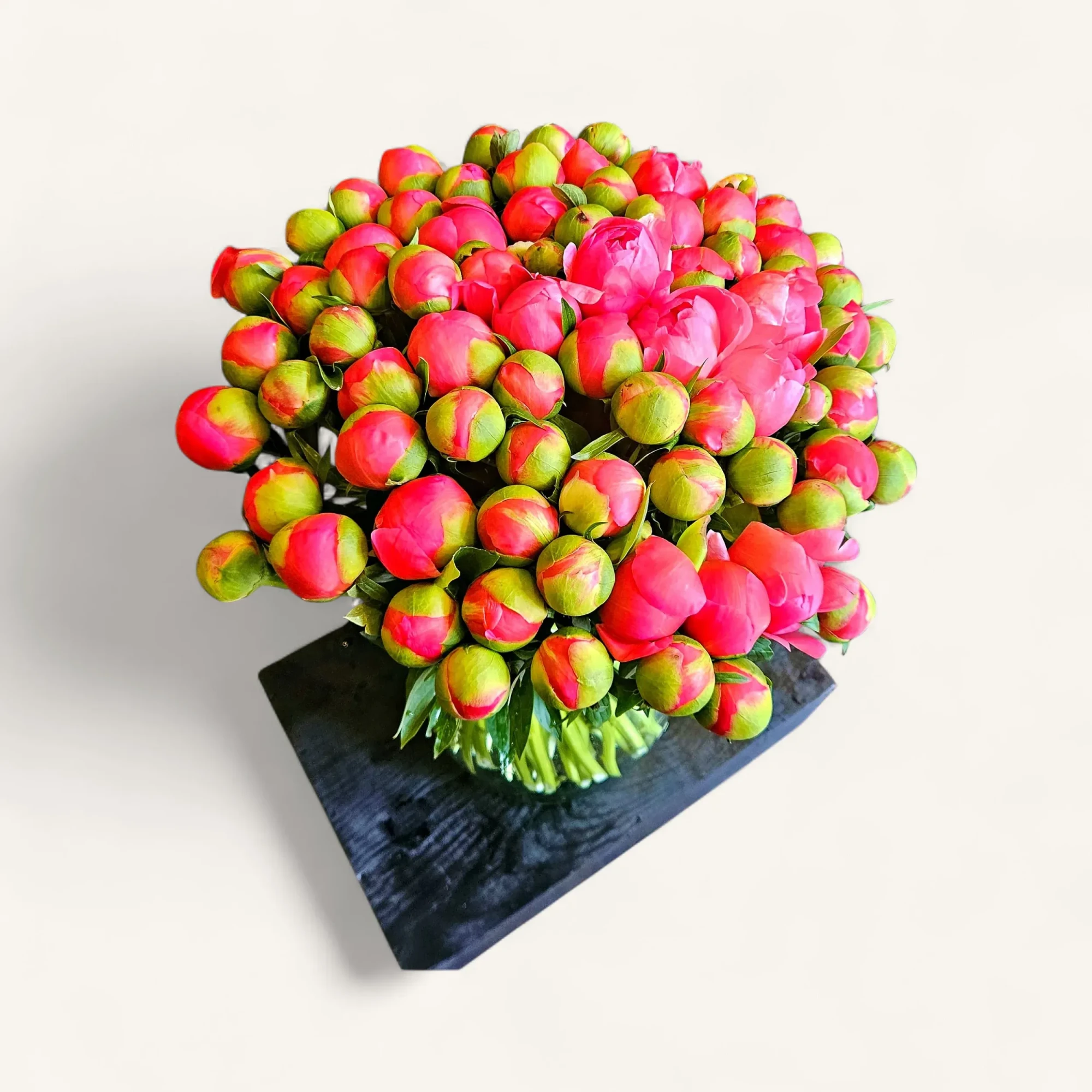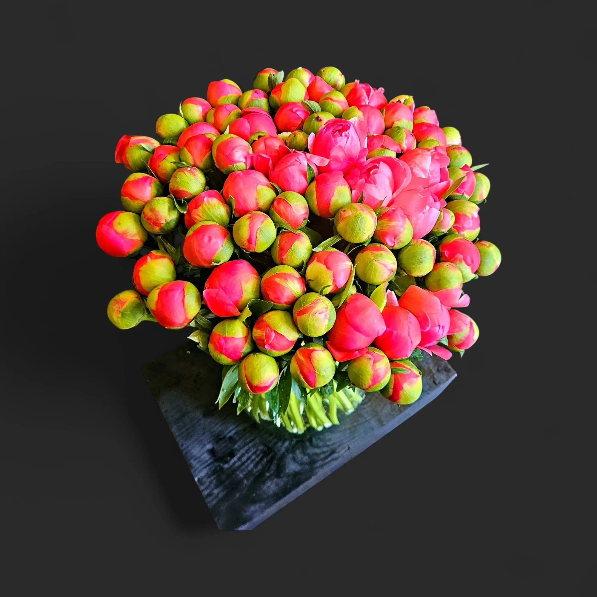 Un dôme opulent de pivoines corail serrées en boutons, organisé en masse compacte comme une pluie retenue sur le point d’éclore. Bouquet de caractère, aux tons corail lumineux bordés de calices verts, idéal pour habiller une console d’entrée ou sublimer une table de réception