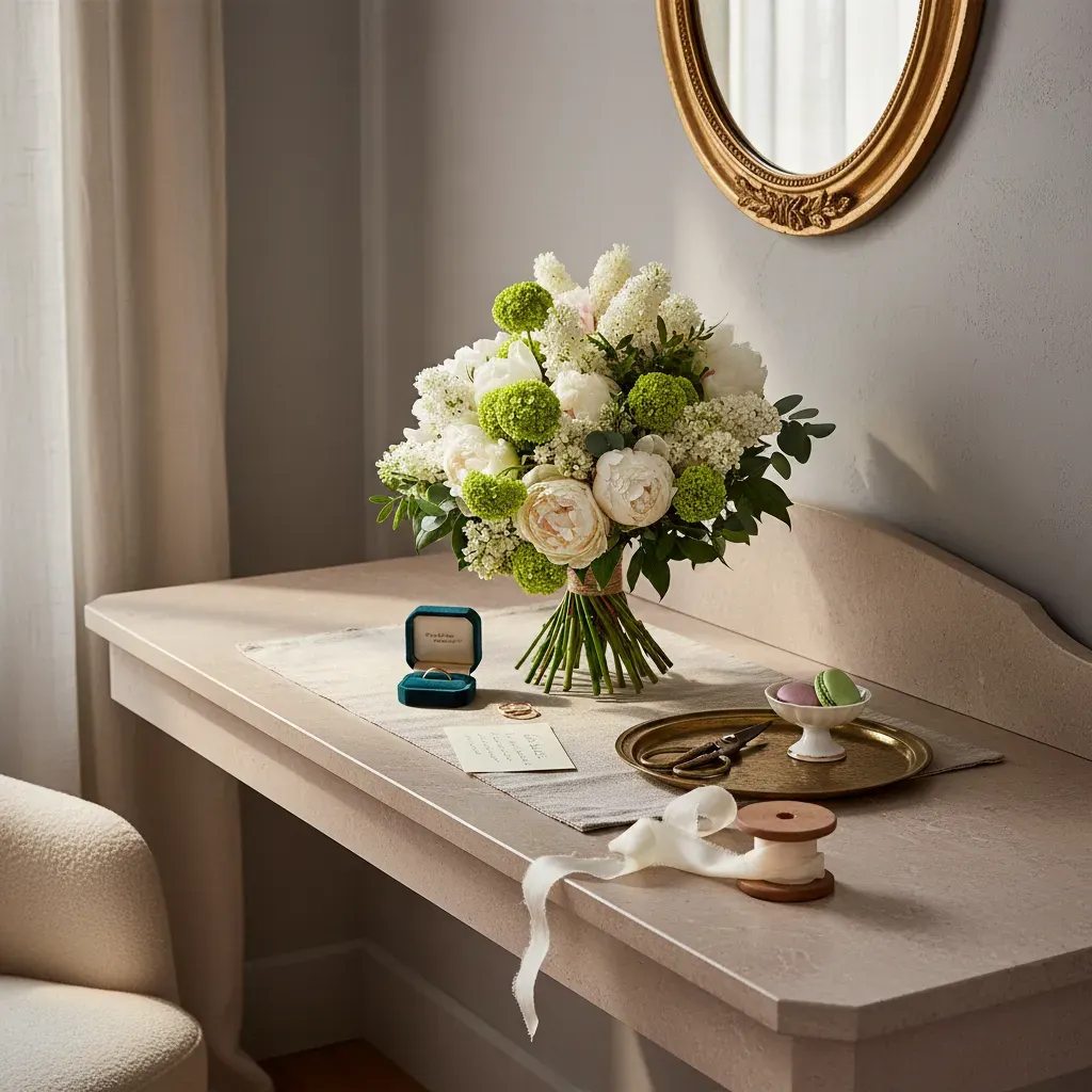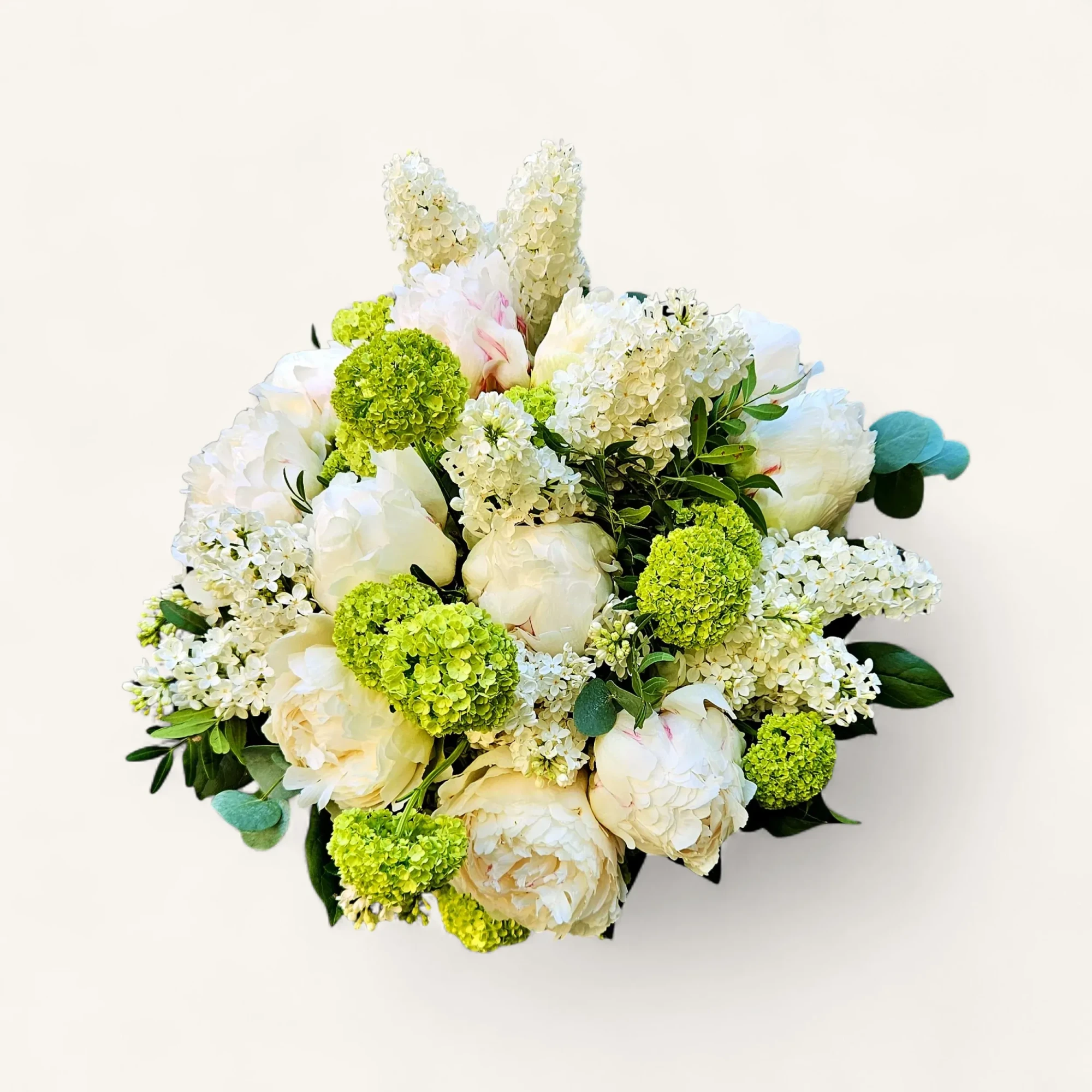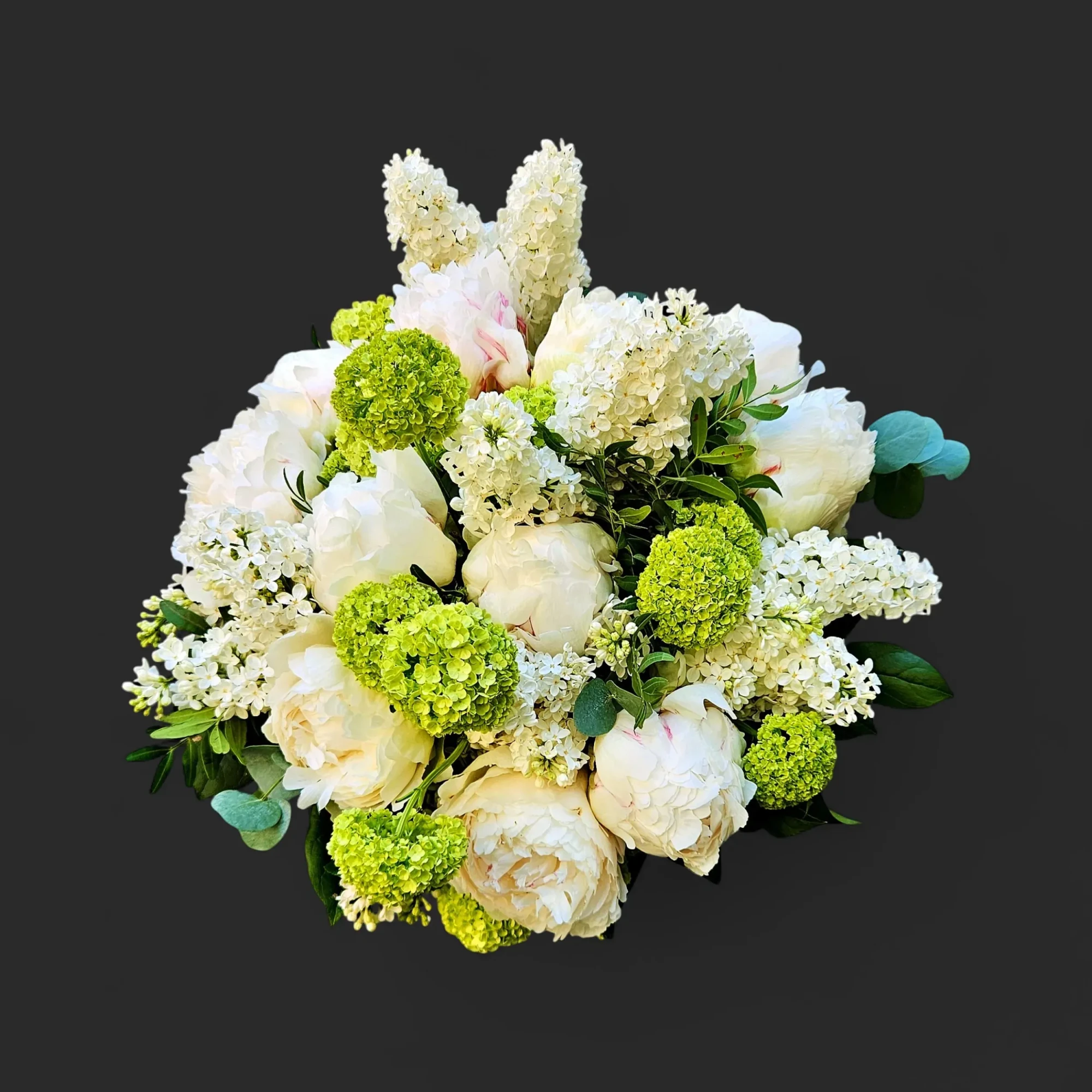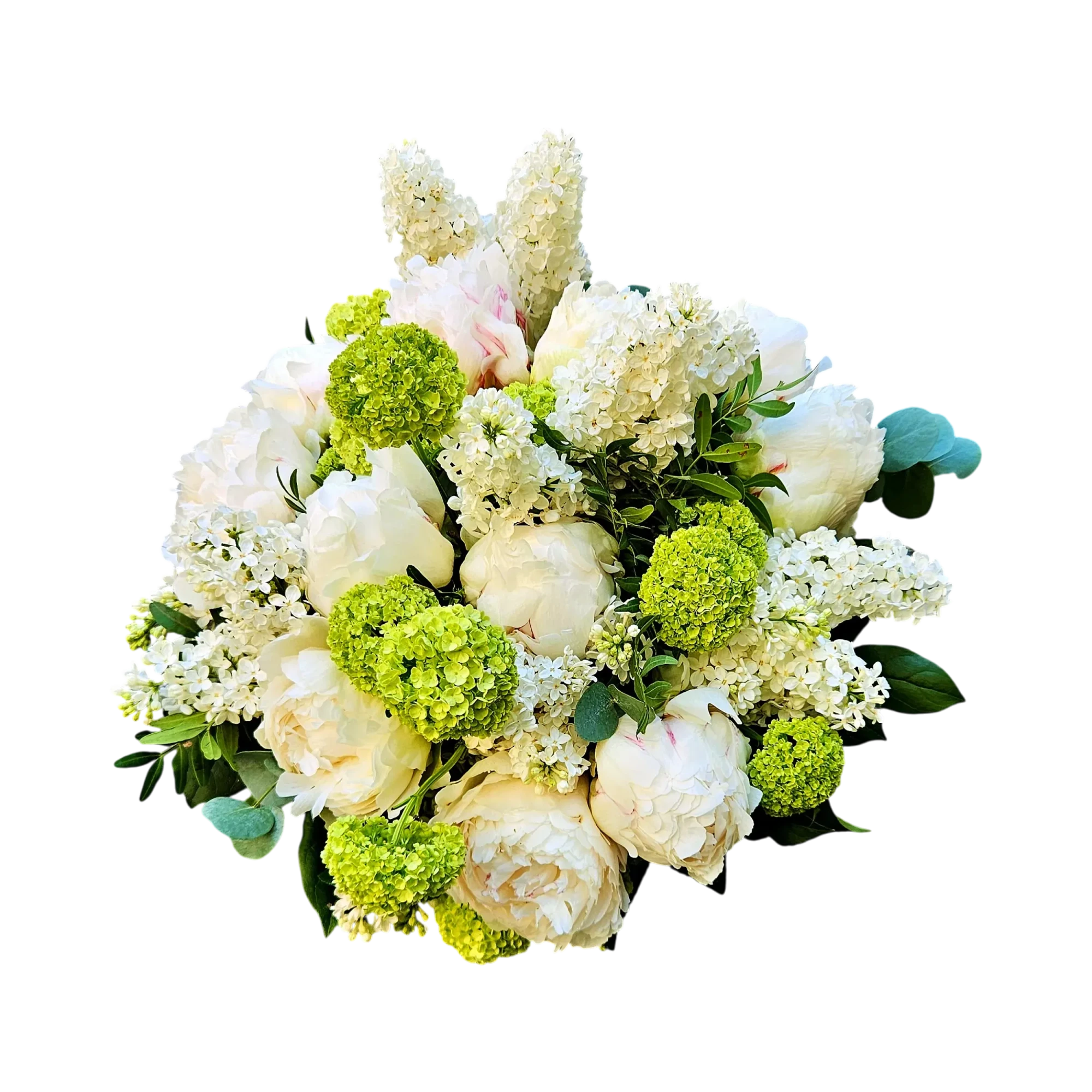 Un dôme blanc, travaillé à la main comme une caresse : pivoines blanches aux éclats satinés s’ouvrent en couches généreuses, ponctuées de grappes de lilas immaculé et de pompons chartreux de viorne qui apportent une note vive et rythmée. Des touches d’eucalyptus soulignent la silhouette et parfument la composition ; pensée comme un cadeau de fête des mères, cette composition marie volume et fraîcheur pour durer tout au long de la journée.