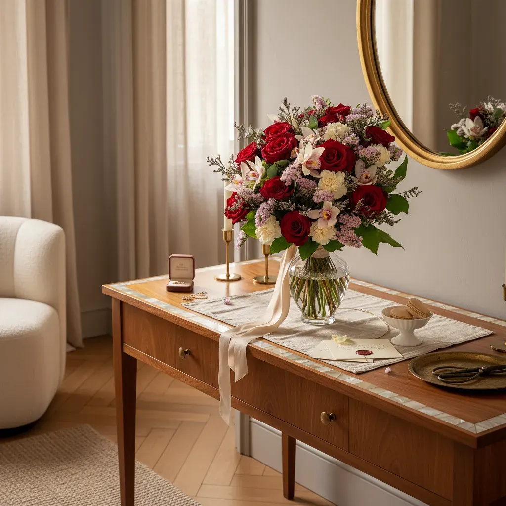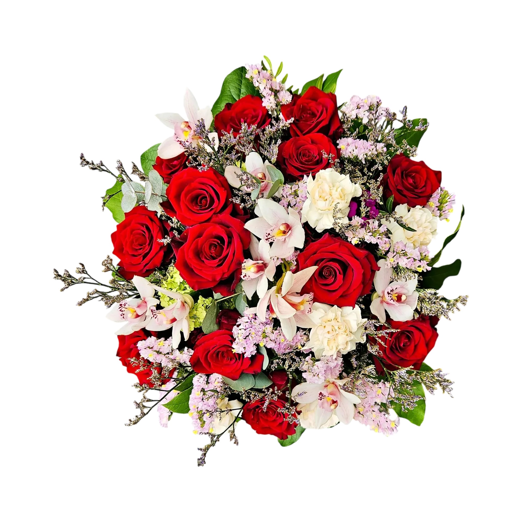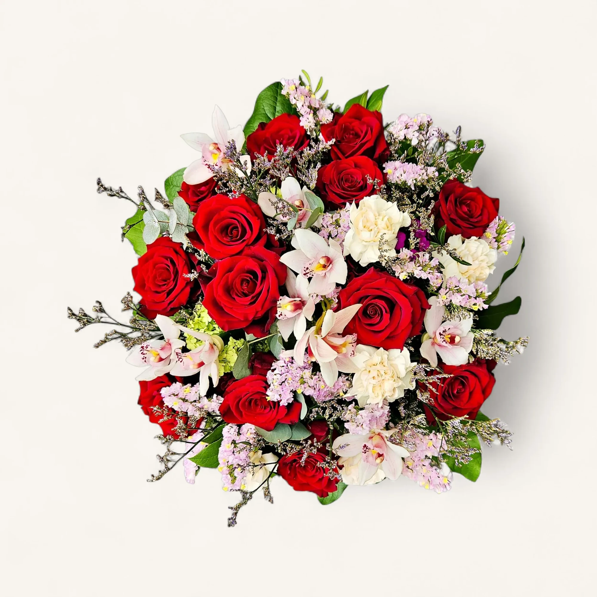 Pensé pour la fête des mères, ce bouquet allie la passion des roses rouges à la grâce exotique du cymbidium. Des nuées de statice lilas et des œillets crème apportent une délicate dentelle, tandis que quelques branches d'eucalyptus argenté encadrent l'ensemble : une composition ronde, couture, qui respire la générosité et l'élégance.