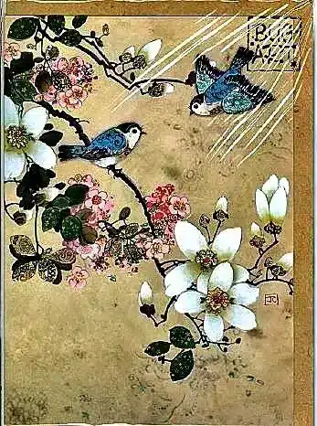 Carte de vœux artisanale conçue pour glisser dans un bouquet : branches peintes de magnolia ivoire et grappes de fleurs de cerisier rose pâle s’entrelacent autour de deux oiseaux bleutés, ponctuées d’accents dorés. Grain de papier naturel, encre et lavis — un compagnon floral qui transforme l’offrande en souvenir printanier, fidèle à la note « carte de voeux pour accompagner les bouquets » laissée par le photographe.